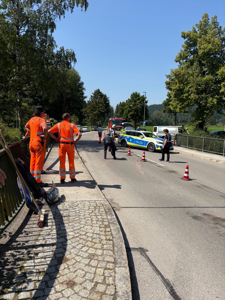 Am Dienstag , den 12.August wurden Wir gegen 11:30 Uhr, gemeinsam mit der Freiwilligen Feuerwehr Schongau, dem Rettungsdienst und der Polizei Schongau, zu einem Verkehrsunfall auf der St2014, kurz nach der Abzweigung zur Wanderhofstraße auf Höhe der Schreinerei/ Herberge, alarmiert.