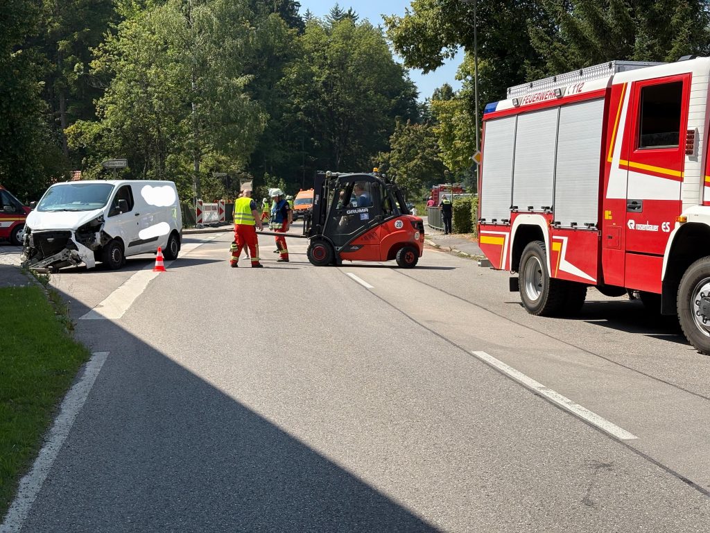 Eines der Fahrzeuge blockierte einen Fahrstreifen, sodass dieses erst mit Muskelkraft und anschließend mit der Unterstützung eines Gabelstaplers unserer Schreinerei zur Seite geschoben werden musste. Nachdem die Polizei mit der Unfallaufnahme fertig war und die Fahrbahn durch die Feuerwehren gereinigt wurde, konnte die Straße wieder für den Verkehr freigegeben werden.
