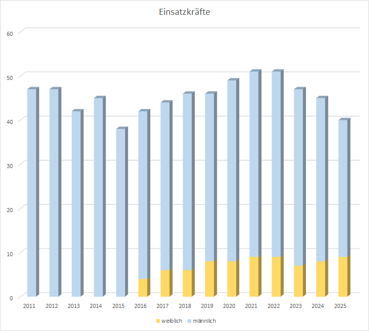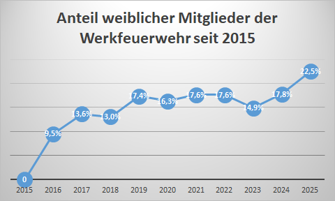 Die Mannschaft der Werkfeuerwehr wird gebildet von 9 Frauen und 31 Männern, das entspricht einer „Frauenquote“ von 22,5 Prozent – worauf wir sehr stolz sind. Die Frauenquote bei Feuerwehren in Bayern entspricht 10,1 %, in Oberbayern 7,6 % und im Landkreis sogar nur 5,5 %.