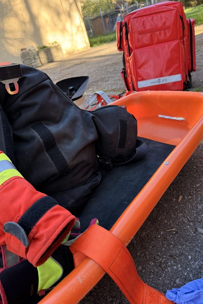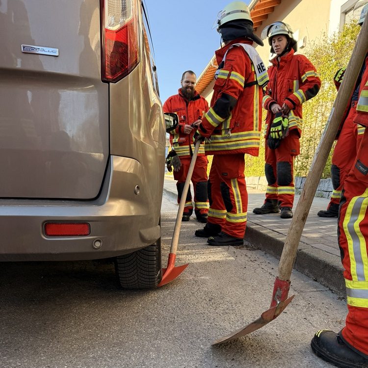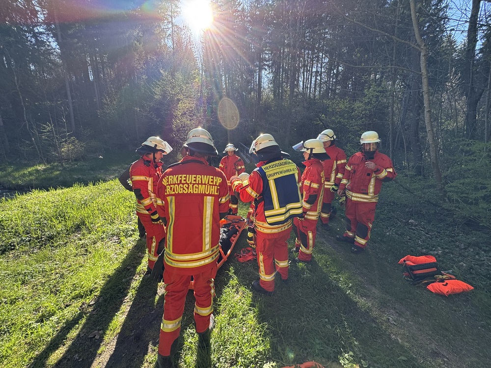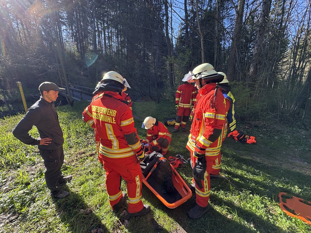 Die Gesamtübung im April behandelte den Themenkomplex Technische Hilfeleistung. In einer Einsatzübung mußte eine Person aus der Schlucht am Mühlenbach gerettet werden. Der Weg zum Einsatzort war mit einem umgestürzten Baum blockiert. Die bewusstlose Person wurde schnell gefunden und durch die Sanitäter der Werkfeuerwehr erstversorgt. Anschließend aus der Schlucht gerettet. Zuletzt mußte noch ein falsch geparktes Auto aus dem Weg geräumt werden.