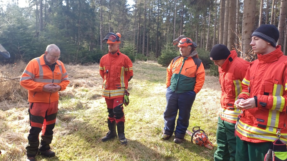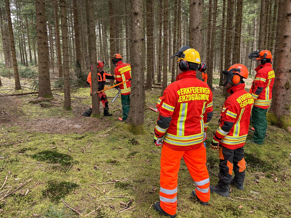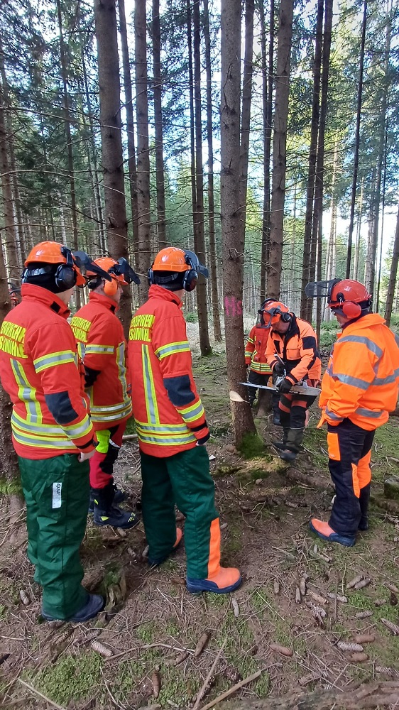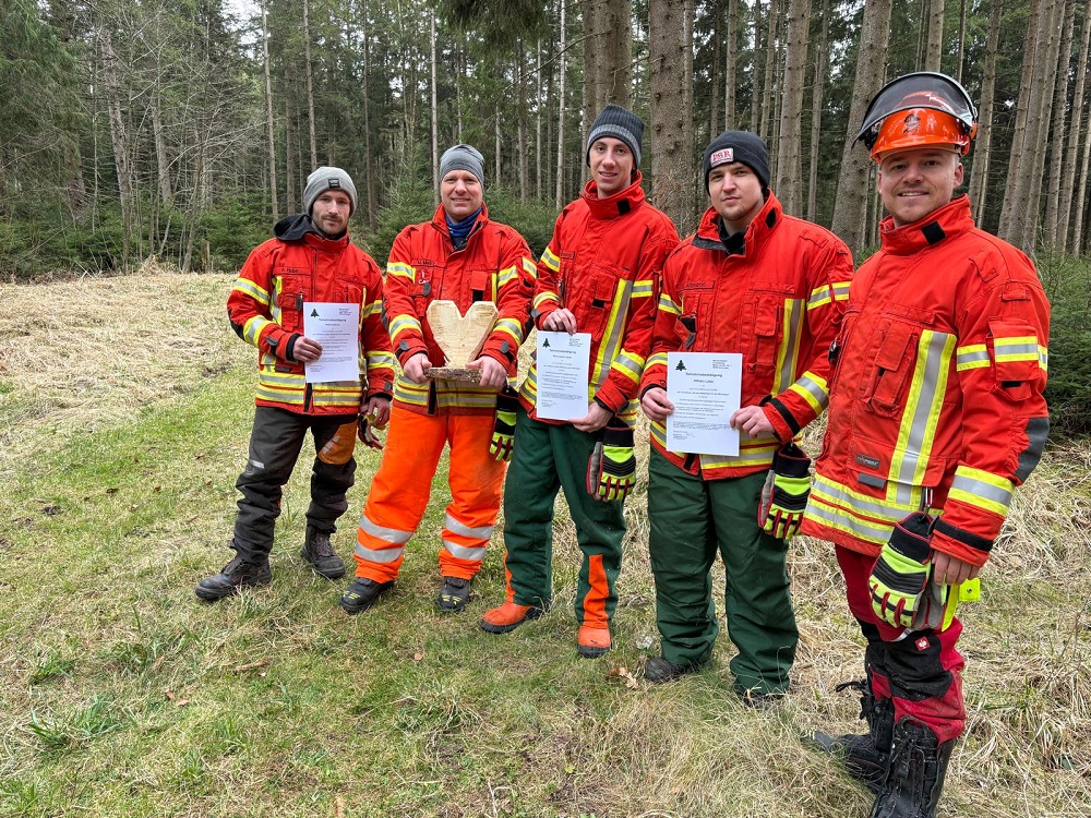 Gleich fünf Einsatzkräfte der Werkfeuerwehr nahmen an einem 2-tägigen Motorsägen-Grundlehrgang in Herzogsägmühle teil: Lukas Altmann, Andreas Huber, Markus Metty, Jonas Wollenweber und Patrick Zeber wurden zu den Themen Grundfertigkeiten in der sicheren Handhabung von Motorsägen, Vertrautheit mit den Grundregeln der Arbeitssicherheit bzw. der Unfallverhütung im Umgang mit der Motorsäge, Einblicke (mit Praxisteil) in die Schneide- und Fälltechnik und Grundkenntnisse der Motorsägentechnik ausgebildet.
