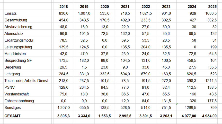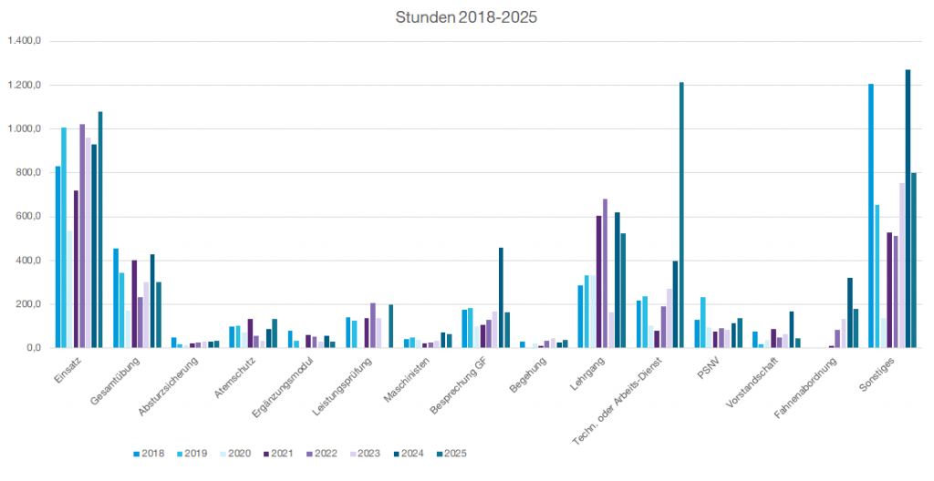 Kommandant Daniel Comtesse begrüßte zunächst die anwesenden Gäste und Mitglieder und begann seinen Bericht mit ein paar Zahlen und Grafiken zum letzten Jahr. Die Gesamtstunden sind ähnlich hoch wie in 2024, es waren dann aber deutlich weniger Besprechungen, dafür mehr Arbeitsstunden, vor allem auf den Baustellen im Gerätehaus.