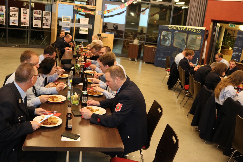 Romina Kuschmierz leitete nach den feierlichen Worten über zum Abendessen: es gab ein saftiges Rindergulasch mit Serviettenknödeln und Bayerisch Kraut. Anschließend eine Nachspeise mit einer Schicht aus verschiedenen Cremes und Obst mit Wallnüssen.
