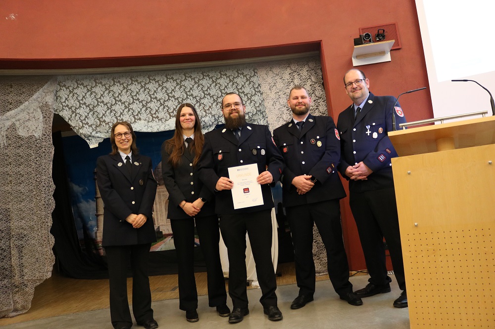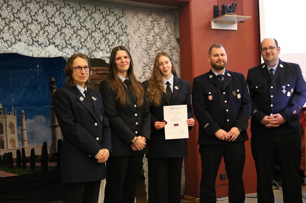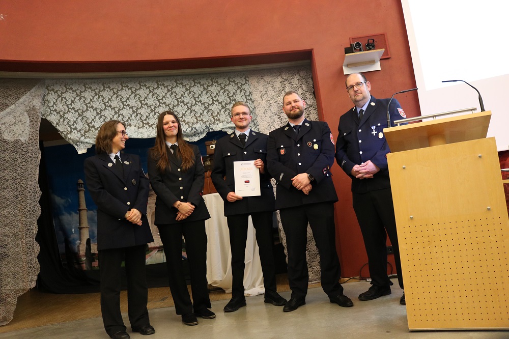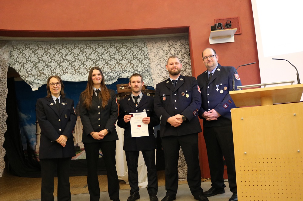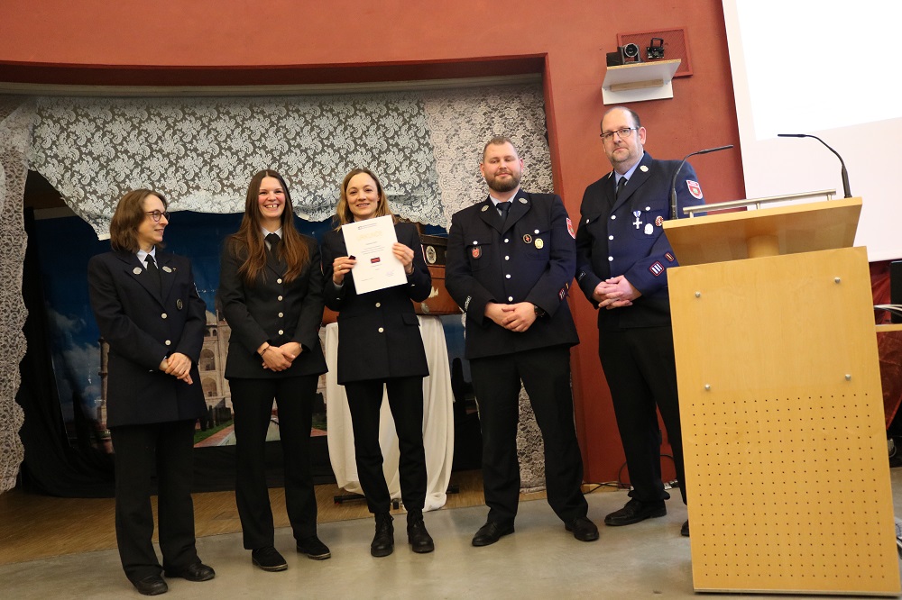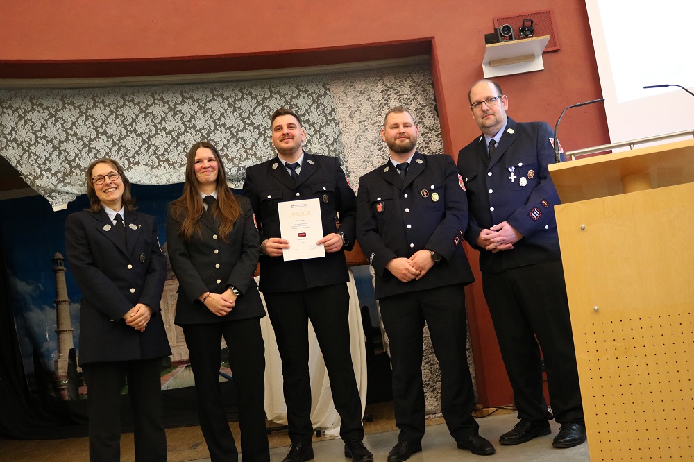 Vier Einsatzkräfte haben im vergangenen Jahr ihren Grundlehrgang (MTA Basismodul) absolviert, sind in den Einsatzdienst übernommen worden und werden daher zur Feuerwehrfrau / zum Feuerwehrmann befördert: Anna Lösch, Stephanie Barth, Stefan Bestler und Sebastian Löscher.
