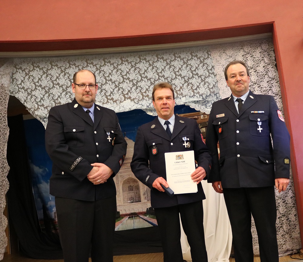 Eine besondere Ehre wurde dann unserem langjährigen Gruppenführer, Kassier und einzigen noch aktiven Vorstandsmitglied aus dem Gründungsjahr des Vereins zuteil: Stefan Ziegler erhielt das Feuerwehr-Ehrenzeichen in Silber vom Bayerischen Staatsminister des Innern, Joachim Herrmann, für 25 Jahre aktiven Feuerwehrdienst. Überreicht wurde ihm das Abzeichen mit Urkunde vom Kreisbrandmeister Michael Christa, dem Kommandant Daniel Comtesse zur Seite stand.
